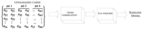 Since the implemented algorithm needs an undamaged structural responses case matrix, it is necessary to obtain a PCA model of it, which is the baseline performance. The matrix is arranged such that each column contains piezoelectric time samples due to guided-wave response (collected over a specific time period from different sensors installed at crucial points of structure), while each row represents a new independent piezoelectric response for the same undamaged structure. The undamaged case matrix is represented by first block of Figure 3.