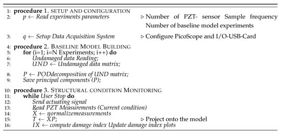 According to Figure 6, the embedded algorithm consists of three procedures: set up and configuration, baseline model building (training stage) and structural condition monitoring (monitoring stage), which are sequentially executed. Once the configuration parameters and drivers to manage data acquisition are established, the transformation matrix P of the statistical model is obtained via Proper Orthogonal Decomposition method (POD) [30]. POD require fewer computational resources over alternative methods such as SVD and NIPALS, maintaining a compromise among resources memory and time consumptioning [20]. Thus, POD method is implemented as processing tool for baseline model building since low memory and execution time are required.