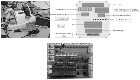 The system is able to acquire signals up to a maximum of 24 PZT sensors, whose hardware was designed with J-fet technology amplifiers (THS4031) that allows a proper bandwidth response (100 MHZ), high switching speed and good signal/noise ratio. Voltage gain is adjustable in order to manage drifts and offset of different structures to be monitored, which is produced by electrical and mechanical coupling effects.