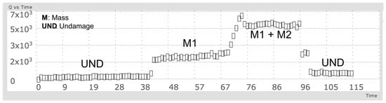 According to Figure 11, a clear difference between undamaged and damaged conditions is observed for abrupt changes in Q-values, and minimal variations are obtained for healthy state of the structure. Also, transient response is captured while the masses are being installed. A second experiment was conducted to evaluate the system response sensitivity by locating the mass (damage) at different points of the test specimen. In this case, two piezoelectric devices (sensor-actuator) were attached near to the structure bridles and 100 experiments per condition (Damaged/Undamaged) were registered. Fifteen damage scenarios, (denominated ), were recreated locating the mass at 5 cm, 10 cm, and so on, respect to the PZT actuator (see Figure 12).