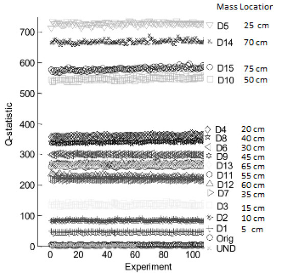 Performance of Q-statistic damage index is shown in Figure 13, where all damage conditions are summarized in a scatter plot with ordered labels according to ascending Q-values for a better visual interpretation. Experiments related to pristine structure cases, used for validation purposes, are labeled as ‘UND’ and those used to build the PCA model as ‘Orig’.