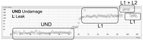 The results presented in Figure 15 confirm the suitability of Q-index for differentiating between damaged and undamaged conditions. In addition, the performance of Q-index shows that the system has capability for detecting different damage types (mass and leaks), high sensitivity to transient response and capacity to recover a previous state or condition. A final remark is highlighted about differentiation between leak and mass-adding damage types, which requires additional modeling stages such as neural networks and complementary features as it is demonstrated in previous works [36]. Thus, by using only Q-index it is not possible to distinguish between mass damage and leak.