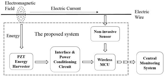 In the case of non-invasive wireless sensor nodes for electricity monitoring applications, the electromagnetic energy is the dominant and most accessible source available to the EH []. Through the PZT-based piezoelectric harvester with permanent magnets, the ambient electromagnetic energy generated from the current-carrying wire is finally converted into electrical energy in a non-invasive manner after an intermediate form of mechanical vibrational energy. The transformed electric energy can be stored in the storage unit (e.g., super-capacitor) and provides the required energy for the WSN. This eliminates the need of external power supply such as batteries.
