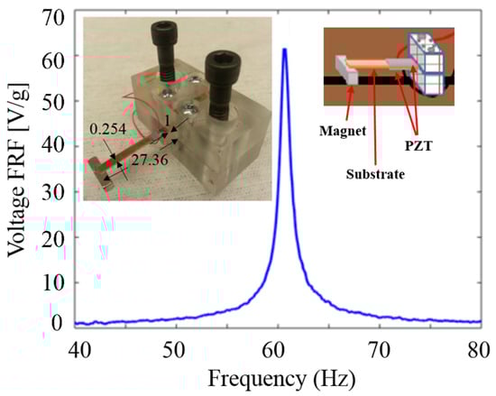 A number of structures have been reported for PZT-based EHs. One of the most popular configurations is the cantilever beam structure [,,]. In our work, a harvester with bulk PZT and permanent magnet tip mass is firstly used with the structure of a simple piezoelectric bimorph cantilever beam. In the experiment, the distance between our cantilever EH (EH1) and the electric wire that carries a 60-Hz AC current is 6 mm. The surrounding electromagnetic energy from the field across the wire is collected by the harvester non-invasively. The voltage Frequency Response Function (FRF) of EH1 is presented as in Figure 2 with the peak voltage at 60.2 Hz resonance frequency which matches the North American 60 Hz power line frequency.