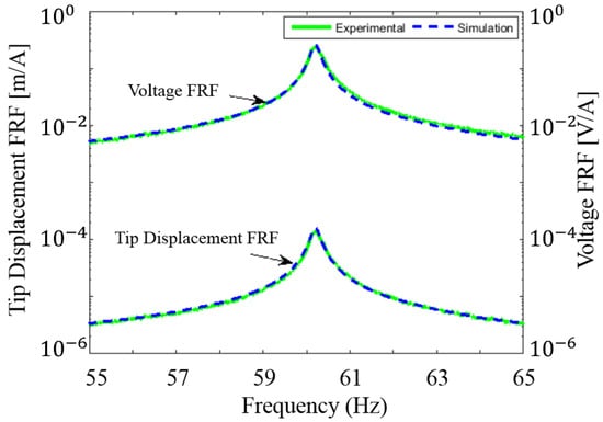 Tip displacement and voltage Frequency Response Function of the EH2 with the peak voltage at 60.3 Hz resonance frequency [].