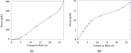 (a) Power output of EH1; (b) Power output of EH2. Measured RMS power output of two harvesters with regard to the current passing through the conducting wire. (The distance between EH1 and the wire is 6 mm and 4.5 mm for EH2 for a higher output power) EH2 has much lower output power than EH1 as a result of screen-printed PZT versus bulk PZT.