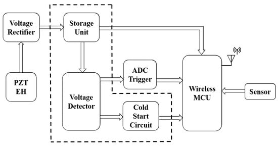 Most EHs including the two used in this work are only able to provide a very small amount of output power on the order of 10 μW to 100 μW [,,] at an electricity usage level from a few amps to a few tens of amps, which puts a constraint on the energy available to operate the control and communication units []. Therefore, the entire WSN is expected to be in proper motion under a substantially restricted power budget below milliwatts. Considering this restriction associated with the operation of EH units, a cold start circuit is necessary to regulate the unsteady and weak output of the EH.