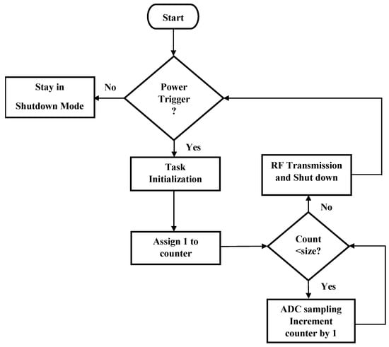 The MCU must be programmed according to the application requirements in order for the wireless sensor node to undertake function properly. Figure 8 shows the application flow chart diagram and algorithm developed for running the system and controlling the wireless sensor node’s operation. The process begins by enabling the MCU’s active mode through a trigger generated by the voltage detector. At this point, task initialization including the following steps begins: