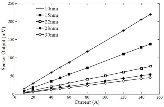 Sensor’s output (RMS voltage) with regard to the current passing through the wire (Output voltage is linearly proportional to the current intensity). Different plots represent different distances between the wire and the sensor [].