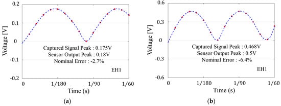 In order to generate data packets to represent a full cycle of the sensors’ signal during each data transmission to decrease the error rate and to verify the consistency and reliability of the device’s operation over time, multiple full-wave rectified sinusoidal signals replicating the sensor’s output for different experiments are fed into the sensor node and the transmitted ADC values are captured and compared to the peak voltage values of the input signal. In Figure 10, the captured data points for two of the arbitrary signals at the receiver node are plotted of a read and transmit process (with 15 points representing a full cycle of the sensor’s signal). The nominal errors associated with peak measurement are −2.7% and −6.4% respectively as a result of discrete sampling, which are caused by the limited number of points available from discrete sampling to cover the sensor’s signal. The measurement results here validate the sensor node’s operation as the peak measurement errors are less than the calculated worst case error of −8.6% (i.e., with an accuracy of 91.4%) as a result of discrete sampling. (If one uses 15 equidistant points to represent one cycle (with period T) of a sinusoidal waveform, the best case is to collect the point with peak value as the measured data, ideally with zero error. Whereas the worst case happens when the point T/15 away from peak point is chosen to stand for the peak value).