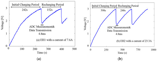In the beginning, it needs an initial charging period to accumulate enough energy from none to complete its very first read and transmit operation. The dynamic behavior of the storage unit with EH1 harvesting from 7.6 A grid current is shown in Figure 11a. It takes 242 s for the storage capacitor to reach 3 V from 0 V to initiate the wireless MCU’s operation. Upon completion of a data sampling and transmission process instructed by the program, the voltage across the capacitor will drop abruptly to below 2 V due to the partial energy consumed by MCU’s operation (the total MCU active time for ADC measurement and wireless transmission is measured to be approximately 4.8 ms). At this moment, the MCU returns to the shutdown mode until it re-accumulates enough energy to send the consecutive data packet. Nevertheless, the relatively long charging time only appears in the very first period. As long as the initial charging process of the storage capacitor is completed, the EH only needs to make up for the voltage drop (around one third of the threshold voltage) caused by the data packing and transmission of the WSN, and the time between subsequent data transmission (recharging period) is much reduced. Figure 11b shows the similar dynamic charging/discharging behavior of the system when the WSN is integrated with EH2.