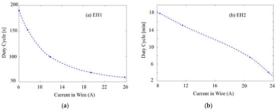 Duty cycle of operation with regard to current intensity passing through the wire when the system is tested with (a) EH1 and (b) EH2. Higher current indicates a shorter duty cycle because of a weaker output power supplied by the EHs.