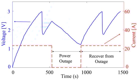 Charging/discharging behavior of the storage capacitor for WSN operations when a power outage occurs. Tested with EH2 when the current in the wire is 23.3 A before/after the outage. Successful completion of data transmission demonstrates the system’s automatic recovering from outages.