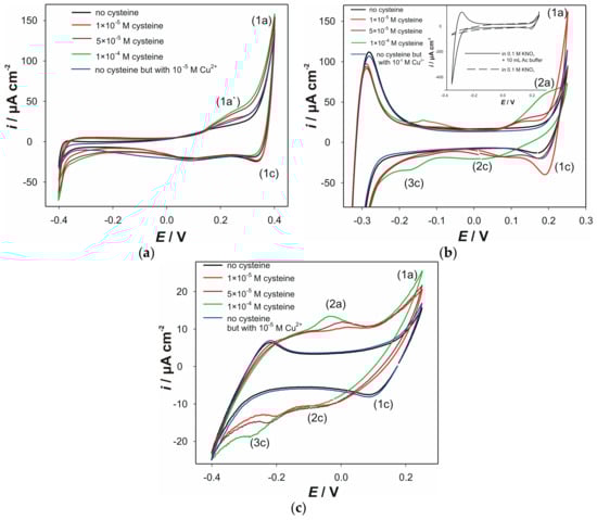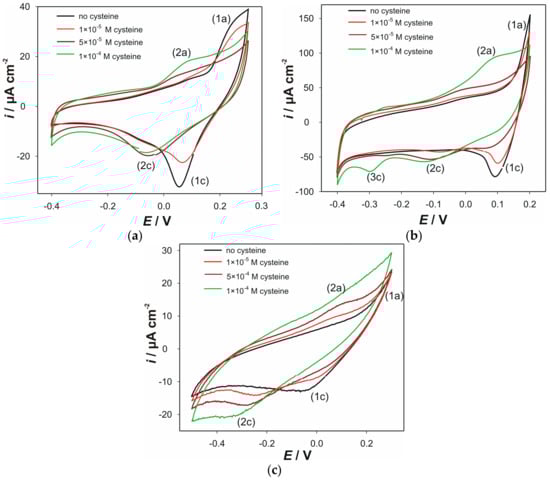 The influence of various cysteine concentrations on cyclic voltammograms of the electrode “ACS” are shown in Figure 2b. Similar to the behavior observed at pH 5, the current peaks (1a) and (1c) correspond to the oxidation of the electrode material. This is followed by the reduction of the oxidation products. The addition of cysteine (5 × 10−4 M) produced the anodic signal that started to occur around −0.05 V (current peak (2a)). This signal becomes more prominent at the higher cysteine concentration (1 × 10−4 M). As it was observed at pH 5, this oxidation current peak corresponds to the anodic oxidation of copper cysteinate, as well as to the anodic oxidation of cysteine. The addition of cysteine also decreases and shifts the cathodic current peak (1c) towards more cathodic potentials (current peak (2c)). This can be attributed to the reduction of copper ions from its complexes with cysteine. Redox activity, observed at cathodic branch of voltammogram (current peak (3c)), is probably related to reduction of cystine.