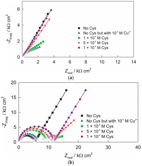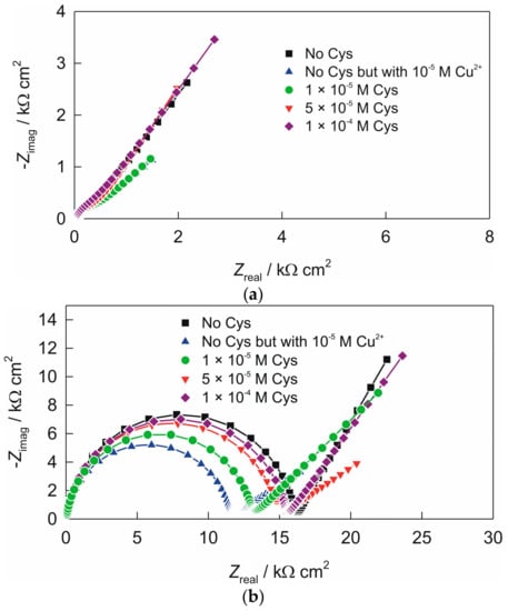 Nyquist plots recorded in 90 mL 0.1 KNO3 + 10 mL 0.1 M acetate buffer (pH 5), without and with the presence of the various cysteine concentration (by successive addition of cysteine in the solutions that were spiked with 1 × 10−5 M Cu2+): (a) electrode “ACS”; (b) electrode “AC1.8S”. Frequency range: 100 kHz–0.05 Hz.