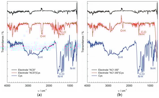 The IR spectra of the: (a) electrode “ACS”; (b) electrode “AC1.8S”. The surface of the electrodes (black line); Surface of the electrode after CVs was performed (red line); Cysteine powder (blue line).