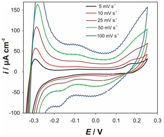 For understanding the undergoing electrochemical reactions, cyclic voltammograms at different scan rates (in the presence of the 1 × 10−4 M cysteine) were recorded at the electrodes “ACS” and “AC1.8S”, at both pH values. Similar psuedocapacitive behavior was obtained for both electrodes. As an example of obtained voltammograms, influence of the scan rate on CVs of the electrode “ACS” at pH 5, is presented in Figure 6.