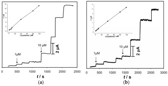 Amperometric responses of the electrode “ACS” on successive addition of cysteine. Measurements were performed in: (a) in 90 mL 0.1 KNO3 + 10 mL 0.1 M acetate buffer pH 5 at the 0.142 V; (b) in 90 mL 0.1 KNO3 + 10 mL 0.1 M phosphate buffer pH 7 at the 0.04 V. Insets show corresponding calibration plots.