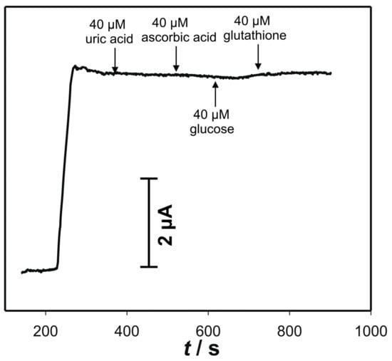 Influence of various species on the determination of cysteine at pH 7, are presented in Figure 8. Obvious current response to the cysteine concentration of 30 μM can be noticed. On contrary, by the addition of uric acid, ascorbic acid, glucose, or even surprisingly glutathione, no noticeable current response was observed. This is mainly a consequence of the relatively low operating potential at pH 7.