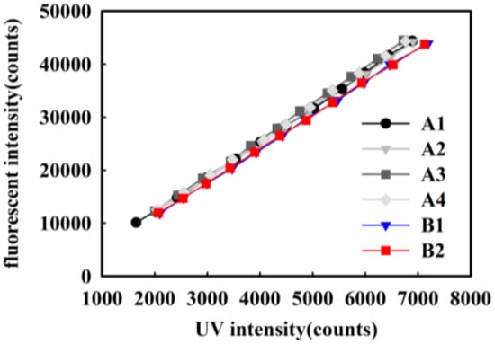 All data points in Figure 14 are from the average of four sets of data detected by the UVOFS and the radiometer. It can be seen that the determination coefficient of the UVOFS is slightly larger than the UV radiometer, showing that the linear response of the UVOFS is superior when compared to the radiometer instrument. Therefore, the comparison provides further evidence to prove that the UVFOS is capable of accurately detecting UV radiation.