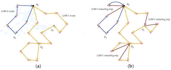 Figure 1. Illustration of a feasible first-stage solution and recourse action for a particular realization of the uncertainty. (a) A feasible first-stage solution to the two-stage FCMURP with two UAVs; the first-stage routes for the UAVs correspond to the ‘here-and-now’ decisions. (b) A feasible recourse action for the two-stage FCMURP with two UAVs; for a given realization of the fuel consumed by any vehicle to traverse an edge, the refuel trips (colored in brown) are added to the first-stage solution.
