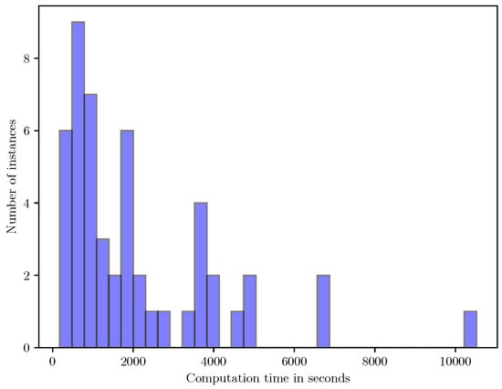The statistical estimate of the lower bound for the optimal objective value of the two-stage stochastic program was obtained using SAA as detailed in Section 4.1. The following parameter values were used to obtain the estimate: N = 10 and | Γ k | = 10 for every k { 1 , , 10 } . All 10 scenarios in each Γ k were independently drawn in accordance with the procedure detailed in the previous section. The scenario set Λ that was used to compute an estimate of the upper bound for C from any feasible first-stage solution (the UAV routes) was generated similarly to the sets Γ k , k = 1 , , 10 , with | Λ | = 1000 . Java’s concurrent libraries were used to parallelize the construction heuristic. Construction and improvement heuristics were run N times, each iteration with Δ = Γ k , k { 1 , , N } .