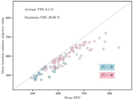 For the large-scale set of instances with | T | { 20 , 30 } , we compare the quality of the solutions produced by the heuristic with the EEV using VSS. We do not use the SAA approach for these instances due to the computational scalability issues of the SAA approach for these test instances. Table 3, Table 4 and Table 5 present the expected value solution’s objective (EV), the EEV, and the heuristic solution objective value (H) for all instances in the large-scale set. Similar to Table 2, the values in brackets denote the standard deviations of the corresponding estimates. It is clear from Table 3, Table 4 and Table 5 that the heuristic is consistently able to provide a solution whose mean cost is strictly less than the mean EEV for every instance in this class, indicating that the value of VSS that is computed using the mean values is strictly greater than 0. The average and maximum values of the VSS (in percentages) for the large-scale set of instances computed using the mean values are 6.4% and 29.69%, respectively. A scatter plot of the mean EEV and mean heuristic solution cost is shown in Figure 3. The fact that all the points lie below the line with slope one indicates that the VSS is strictly greater than zero for all the instances. Finally, Figure 4 shows the box plot of the computation time taken by the tabu search heuristic to compute a feasible solution for the FCMURP on all the instances in the large-scale set. It can be observed from the box plot that the computation time for the heuristic solution approach is well within six minutes for all these instances.