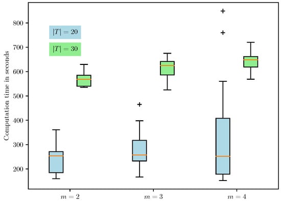 Figure 4. Box plot of the heuristic run times for the second set of instances. The mean run times, in seconds, for m = 2, m = 3, and m = 4 for | T | { 20 , 30 } are given by ( 243 , 310 ) , ( 275 , 354 ) , and ( 327 , 360 ) , respectively.