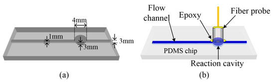 The fluidic chip was molded with polydimethylsiloxane (PDMS) following a stainless-steel template. The molding template with positive structures is shown in Figure 2a. The PDMS base and curing agent (Sylgard 184; Dow Corning, Midland, MI, USA) were mixed (mass ratio 10:1), de-gassed, and then decanted on the template. After that, the mixture was thermally cured at 60 °C for three hours before the PDMS chip was peeled off from the template and bonded on a glass slide. For ensuring the permanent bonding between the PDMS and the glass slide, we treated the PDMS chip by exposing it to an oxygen plasma (Plasma Prep II, Structure Probe, West Chester, PA, USA) for 30 s before bonding with a glass slide. Such treatment guaranteed a robust fluidic chip that avoided fluid leakage even with the presence of high-velocity flow. The built-in structures, a flow channel (diameter 1 mm), and a reaction cavity (diameter 4 mm, depth 3 mm) were formed on the fluidic chip. The fiber optic probe, consequently, was inserted into the reaction cavity. Epoxy was again employed to seal the cylindrical interface between the probe and the cavity wall to prevent any possible air influx during the detection. A completed fluidic biosensor, consisting of a fluidic chip and a fiber optic probe, is shown in Figure 2b.