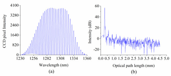 Figure 4 shows the background interference signal obtained with the presence of PBS buffer at the spectral domain (Figure 4a) and time/spatial domain (Figure 4b), respectively. The interference signal at the spectral domain is an amplitude-modulated cosine signal generated by the light source following its spectral distribution function. The amplitude of the cosine signal corresponds to the signal peak at the time/spatial domain and manifests the SNR of the system. The exposure time of the CCD is adjusted in order to maximize the peak value of the cosine signal. As shown in Figure 4a, the valley value of the cosine signal was zero, which was achieved by adjusting the reference light intensity to approximately equal to the sample intensity. In this study, this adjustment was conducted by filling the air gap between the optical fiber and coverslip with epoxy, which is not only an adhesive but also a material that provides an appropriate reference reflectivity, Rr, which satisfies (n1 and n2 are the refractive indices of the fiber and epoxy, respectively). When the peak value of the cosine signal is maximized and the valley value is approximately equal to zero, a maximum amplitude and, thus, a maximum SNR and minimum phase noise can be obtained. By this way, the performance of the biosensor was optimized with a measured SNR of 58 dB.