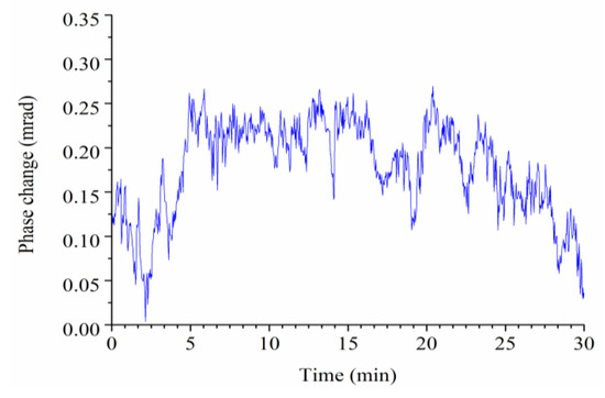 For evaluating the stability of the phase characterization, we first measured the phase dynamics only with the injection of PBS buffer (without interactive or binding molecules) within 30 min. As shown in Figure 5, the total dynamic range of the measured phase, within the 30-min duration, was less than 0.27 mrad (thickness of 28 pm in air). This demonstrated that the biosensor has excellent phase stability.