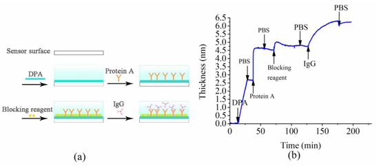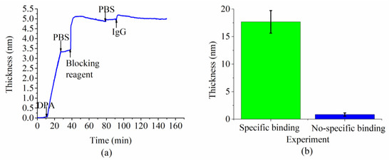 To demonstrate the capability of the developed fluidic biosensor in real-time molecular detection, the biosensor was used for detecting IgG molecules (rabbit IgG solution, 30 µg/mL). Figure 6a shows the procedures of molecular modification and binding. IgG molecules are specifically binding on the protein A modified probe surface. The change in thickness of the molecular layer during the procedures of molecular modification and binding is illustrated in Figure 6b. The first three stages exhibiting a dramatic increase in thickness at the 14th, 38th, and 71st minute after data acquisition correspond to the deposition of dopamine, protein A, and blocking reagents, respectively. The last thickness increase, which appeared more progressive, was induced by the specific binding of IgG molecules. The presented biosensor is limited in detecting molecules that can have strong rearrangements of their tertiary structures. Changes in tertiary structures of the target molecules may alter the dimensions of the target molecules and, thus, affect the measurement results [24,25]. However, the changes in molecular dimension due to the alterations in the tertiary structure are insignificant when compared with the dimensions of the target molecules. As a result, our system and method are still valid when detecting molecules with specific tertiary structures.