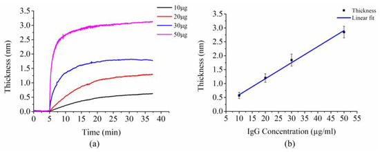 (a) The thickness dynamics corresponding to binding of target IgG at concentrations of 10, 20, 30, and 50 µg/mL. (b) The linear relationship between the thickness change and the concentration of the target IgG solution. Each plotted data point was averaged from three measurements. The blue solid line is the linear fit.