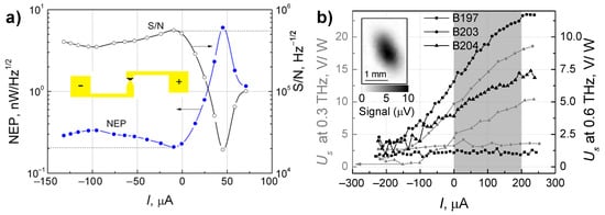 - Minkevičius, L.; Tamošiūnas, V.; Kojelis, M.; Žąsinas, E.; Bukauskas, V.; Šetkus, A.; Butkutė, R.; Kašalynas, I.; Valušis, G. Influence of Field Effects on the Performance of InGaAs-Based Terahertz Radiation Detectors. J. Infrared Millim. Terahertz Waves 2017, 38, 689–707. [Google Scholar] [CrossRef]