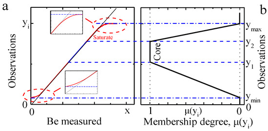 The criteria for the key parameters in the membership function are closely related to system characteristics. The ymax and ymin are limited values of a sensor’s output range. Any observations beyond ymax and ymin must be outliers, and we assigned membership degree 0 to them, i.e., their fidelity is none. y1 and y2 have fuzzy certainty, which is used to determine the range with the best linearity and make fuzzy optimal selection of observations. These observations between the two critical points y1 and y2 have the highest confidence, and we assigned membership degree 1 to them, which comprise the core of the membership function. However, the scope of this area is not strictly defined and can be appropriately adjusted according to different sensor responsivity and experimental purposes. We assigned membership degree 0 to 1 for the other observations based on their measurement value. The functions from ymin to y1, and from y2 to ymax are specifically designed on the basis of the respective major problems to be solved. The signal in the low amplitude interval is greatly affected by the random noise, so it is necessary to reduce the contribution of the low-SNR observations; while the signal of the high amplitude interval mainly addresses the difficulties of signal distortion and saturation caused by the non-linearity of the sensor’s responsivity. A membership function assigned for a typical responsivity of a photosensor (Figure 1a) is shown in Figure 1b.