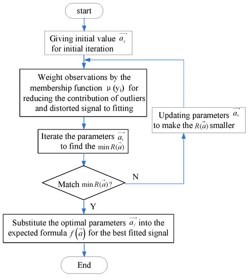We programmed the entire algorithm in OriginPro and LabView software. First, we predicted the initial values of parameters by the least-squares method or experimental results. Next, we weighted observations by assigning a membership function. The fitting parameters were continuously involved in the iterative process until the sum of squared residuals was minimized. Finally, the optimal parameters were obtained to complete the MFW-LM algorithm. The flowchart of this process is shown in Figure 2.