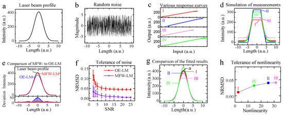 Demonstration of MFW-LM algorithm. (a) Simulated laser-beam profile with Gaussian distribution; (b) random noise; (c) illustration of various response curves; (d) simulated signals corresponding to various response curves in c and random noise in b; (e) comparison between original (a) and fitted values by the MFW- and outliers-excluded (OE)-LM algorithms with response curve I in c; (f) noise-tolerance comparison of MFW- and OE-LM algorithms with response curve I in c; (g) comparison of fitted results with various measurements in d; (h) non-linearity tolerance of MFW-LM algorithm. MFW-LM denotes membership function-weighted Levenberg–Marquardt algorithm; OE-LM denotes outliers-excluded Levenberg-Marquardt algorithm; NRMSD denotes normalized root-mean-square deviation.