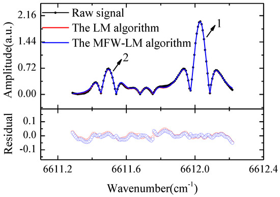 The bottom panel of Figure 8 shows the fitting residuals. The data in the areas marked by the red rectangles have the highest fidelity. The relative NRMSD of the MFW-LM algorithm in the red rectangular areas was as low as 4.1% [Equation (7)].