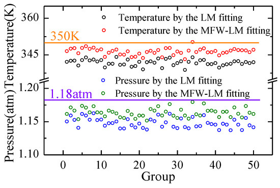 The temperature of the experimental environment measured by a thermocouple was T = 350 K. Then, the pressure calculated according to the ideal gas law was P = 1.18 atm. The temperature and pressure measurement uncertainties obtained by the LM algorithm were 2.6% and 6.8%, respectively.