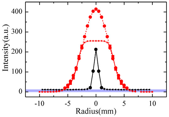 Laser-beam profile is usually measured by image sensors to improve detection efficiency. At present, the analog-to-digital converter of an image sensor is mostly 8- or 10-bit, which means that the dynamic range (DNR) of a sensor is only 256 or 1024. In order to avoid image sensor saturation, the usual practice is to pick off a small fraction of the beam with a neutral density filter or a beam splitter in front of the image sensors, resulting in the serious loss of laser-beam profile details and the inaccurate reflection of laser-beam spatial characteristics. For example, due to the pixel resolution of the image sensor, only a few intensity points can be resolved within the dramatically changing range of the laser-beam profile, and the analysis of the laser-beam profile based on a small amount of data is considered to be unreliable. If we do not do this, even if it causes slight saturation on the laser-beam profile, the MFW-LM algorithm has been simulated and verified to accurately reconstruct the laser-beam profile, so that more intensity points of the laser-beam profile can be distinguished, giving us a chance to mine hidden information (as shown in Figure 6).