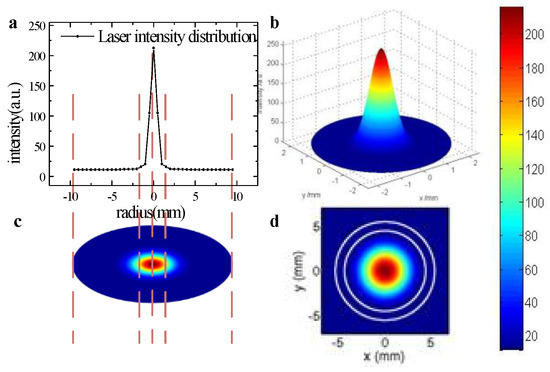 We assumed a laser beam featuring a Gaussian function based on a large number of previous studies [32,33,34,35], which was described by Equation (5) and is shown in Figure 3a: