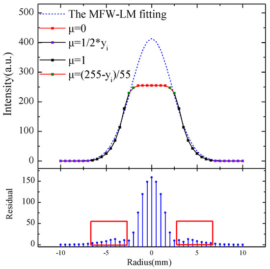 Therefore, the MFW-LM algorithm is extremely robust and effective in minimizing the contribution of outliers and distorted signals and accurately reconstructs the laser-beam profile when dealing with optical sensing with small datasets; that is, the proposed MFW-LM algorithm is suitable for curve fitting that requires high-precision measurement.