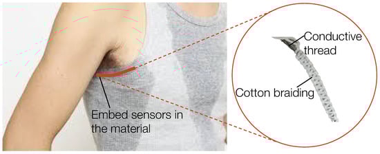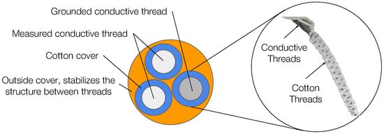 In this work, we target these aforementioned problems and present a new sensor design that measures an individual’s perspiration quantity. Our textile-based sensor is comfortable to wear, robust against body movements, and can be manufactured at large scale and low-cost. The purpose of the design is to measure the resistance between conductive threads, which changes according to the amount of sweat absorbed by the cotton braids between the threads []. However, weaving conductive threads directly into cloth does not guarantee stable and constant separation between cotton braids and conductive threads, especially when subjected to movement. To maintain a stable structure, we designed a second, structured cotton cover. Three conductive threads with cotton braids were then positioned to form a stable triangular structure and an external cotton cover was braided to keep them in position, as shown in Figure 1. The three-thread design allows not only stable sensor structure even during strenuous activities, but also multiple measurements to average, which ensures stable measurements. Besides usability advantages, our sensor is low-cost and production ready with standardized techniques for machined weaving []. The prototype sensors used for experiments in this paper are made by hand. If manufactured by commercial machinery, the consistency of the braiding would improve, increasing the stability of sensing performance.