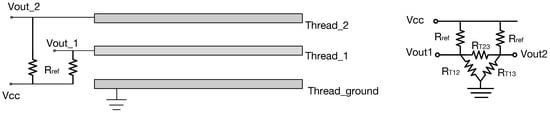 An equivalent circuit is shown on the right hand side of Figure 4, where , , and are equivalent resistors between thread pairs Thread_1 and Thread_ground, Thread_2 and Thread_ground, and Thread_1 and Thread_2, respectively. We consider and here as the in Equation (1). Ideally, when the solution is distributed onto threads evenly, the values of and are the same. It follows that the potential difference of and are the same and the resistance between Thread_1 and Thread_2 can be ignored.