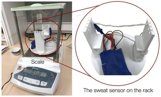 We conducted the calibration experiment in a room with consistent temperature and humidity. We used sodium chloride solution (salt water) as a sweat substitute for sensor calibration. Prior research shows that the sodium concentration of human sweat can vary between 117 and 172 mEq per L with an average of 137.8 mEq per L [], which is approximately 8.06 mg per L for NaCl. Therefore, in the sensor calibration experiment, we used 1% sodium chloride solution as a substitute for human sweat []. Figure 5 shows the sensor calibration hardware setting. The tested sensor is fixed on a 3D-printed rack, and the entire rack is placed on a scale (the scale we used for measurements in this work is Ohaus Pioneer) that can measure weight differences up to 1 mg.