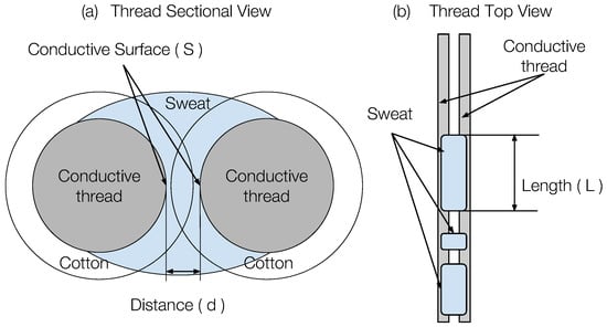 where R stands for resistivity [], d the distance between the conductive thread, and S the conductive thread surface that is soaked by sweat, depending on the amount absorbed.