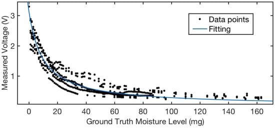 To map the measured sensor output (in voltage) to the quantity of moisture between threads (in the unit of mg), we conducted sensor calibration. We applied known volumes of salt solution onto the sensor and measured the voltage output of the sensor. Then, we conducted a fitting based on a simplified equation of solution resistance, which we explain in detail in Section 5.