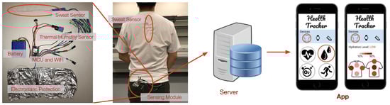 The sensors measure the output voltage from sensors embedded at designated areas on the body and use the calibration fitting curve to calculate sweat quantity. Once the sensing module measures sensor resistance change in the form of divided voltage (DC), it sends the measurements to the server as shown in Figure 8. For each sweat sensor, the system obtains two output voltage values from the non-grounded conductive thread and calculates the average . Then, the system maps the average voltage values to sweat quantity based on the mapping relationship learned from the sensor calibration, as discussed in Section 5.