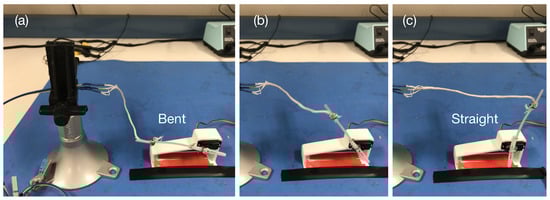 Sensor characterization with motion caused sensor bending. (a) fully bent, motor position is 90. (b) half bent, motor position is 45. (c) straight, motor position is 0.