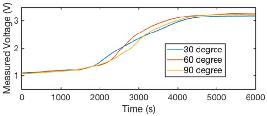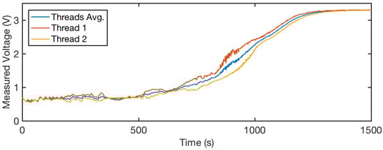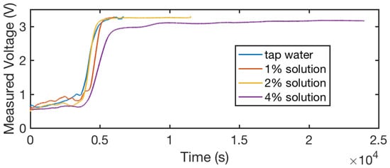 Figure 14 shows the curves of sensor outputs—average voltages from two threads—under these four concentration levels during the evaporation process. As discussed before, the 1% solution is a similar electrolyte concentration to human sweat []. We observed that for the solution that is significantly higher than sweat—the 4% solution—the measured voltage does not return to volt after it dries, which may be caused by the high concentration of the electrolytes, which are conductive when the humidity level in the air is high. The low concentration solution we investigated demonstrated a consistent performance across the evaporation process. Our experiment indicates that the sensor’s sensitivity and dynamic range remains consistent for most people’s sweat concentration range (the variation is less than the average concentration) [,].
